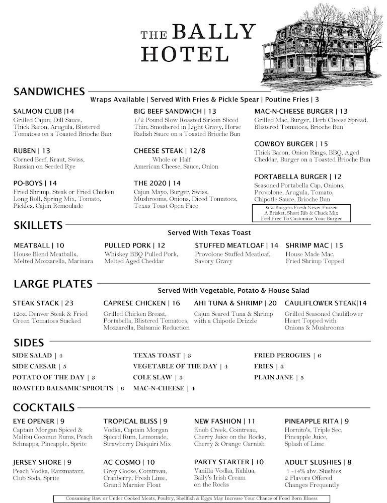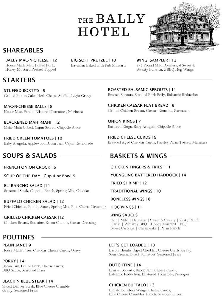Welcome to The Bally Hotel, your go-to destination for a delicious American dining experience in the heart of Bally, PA. Located at 660 Main St, we offer a welcoming atmosphere perfect for casual dining, whether you're here for brunch, lunch, or dinner. Enjoy our extensive menu featuring local specialties, excellent cocktails, and a wide selection of beers. With accessible seating and rapid service, we cater to everyone, including solo diners. Join us for live concerts and happy hour specials, or unwind in our cozy bar. Come experience great food, warm hospitality, and a delightful ambiance at The Bally Hotel!